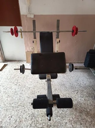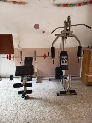 Se vende equipo de gimnasio multifunción, ideal para entrenar en casa. - Incluye banco de pesas. - Incluye máquina de poleas. - Barra de pesas con discos. * Se vende junto o separado, 150€ cada máquina.