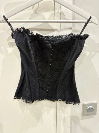 Elegante corsé negro con detalles de encaje. De antigua tienda Blanco, talla S. Es prenda de vestir (no lencería), pensado para llevar como top con pantalones, faldas o para looks de fiesta. Queda muy favorecedor y estiliza la figura, pero a la vez es cómodo de llevar. Con cierre ajustado frontal con corchetes. Perfecto para salir, eventos, cenas o looks más arreglados.