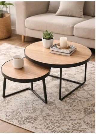 Conjunto de dos mesitas auxiliares con un diseño moderno y elegante. - Tableros redondos con acabado en madera. - Patas y estructura de metal negro.