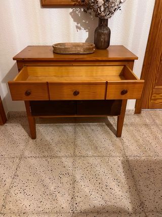 Mueble recibidor con un diseño clásico y funcional. Ideal para dar un toque cálido a tu entrada. - Un cajón grande superior. - Dos puertas inferiores con tiradores con capacidad de almacenaje. - Patas de madera