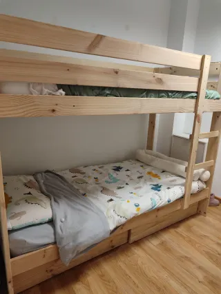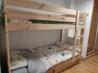 Litera de madera natural, ideal para habitaciones infantiles o juveniles. Su diseño sencillo y robusto la hace perfecta para cualquier espacio. Lleva dos cajones grandes para guardar cosas debajo. - Fabricada en madera natural. - Acabado en tonos marrones y blancos.