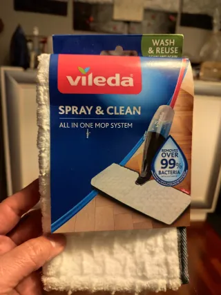 Dos repuestos para la mopa Vileda Spray & Clean. Son lavables y reutilizables. - Diseñados para eliminar más del 99% de las bacterias. - Aptos para el sistema de mopa todo en uno.