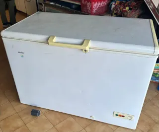 Congelador horizontal de la marca Haier en color blanco. Ideal para almacenar alimentos. - Tirador en color amarillo. - Indicadores de funcionamiento en la parte frontal. No se envia
