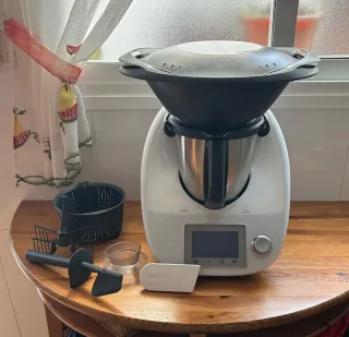 Thermomix TM5, con todos los accesorios: Vaso, cuchillas, tapa, cubilete, espátula, mariposa, cestillo y recipiente Varoma completo con bandeja. Incluye el Cook-Key, el accesorio que hace posible conectar la thermomix a la App Cookidoo de thermomix para obtener la cocina guiada. La máquina y los accesorios están en muy buen estado, el Varoma prácticamente nuevo. *La báscula no funciona.*