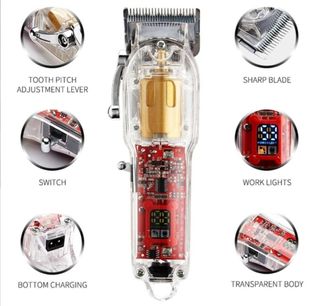 Entrada: 100V-240V, 50-60Hz Material de la hoja: acero inoxidable Fuente de alimentación: eléctrica de Trabajo: 3 horas Características del producto 1. Cabezal afeitado paso Ultra corto de 0,2 MM. 2. Textura corporal totalmente transparente. 3. Maquinilla de cortar el pelo-Pantalla de estructura. 4. Acero de alta calidad. 5. Cabezal de corte extraíble