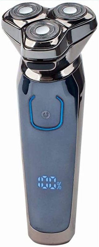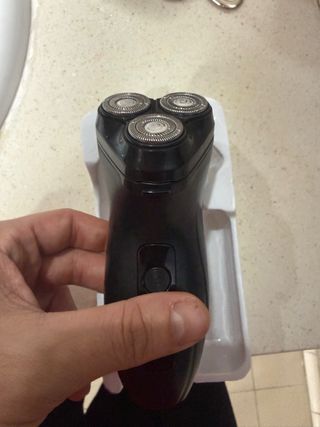 Afeitadora eléctrica rotatoria de color negro. - Tres cabezales de corte. - Botón de encendido/apagado.