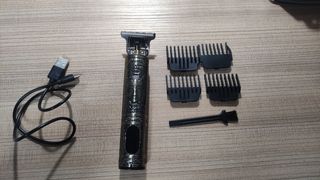 maquinilla de afeitar nueva, junto a un cable para cargarla y cuatro diferentes accesorios para cortar el pelo.
