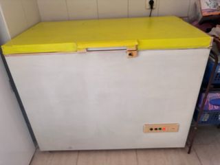 Congelador tipo arcon con tapa superior de color amarillo. Ideal para almacenar alimentos. - Color exterior blanco. - Tapa superior de color amarillo. - Panel de control frontal. Lo amarillo se le puede quitar Recogida en Aguadulce