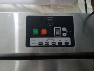 Máquina de envasado al vacío METRO Professional en buen estado. - Panel de control con botones Start, Seal, Power, On/Off, Marinate, Accessory, Pulse vac, Impulse seal. - Pantalla digital para Seal Time. - Diseño profesional en acero inoxidable.