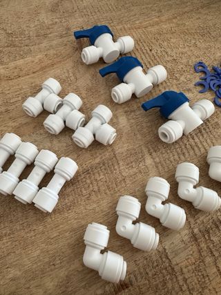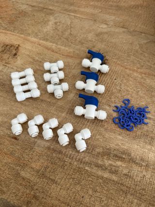 Lote de accesorios para sistemas de ósmosis inversa. - 5 conectores rectos. - 3 conectores en T. - 5 codos de 90 grados. - 3 llaves de paso. - abrazaderas de sujeción. Nuevo a estrenar. todo lo que se ve en la foto.