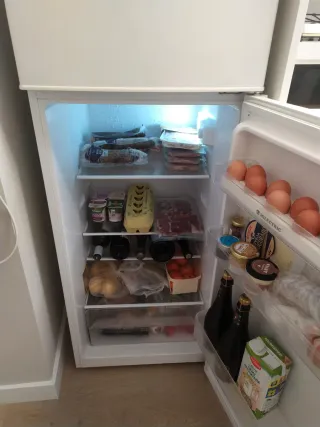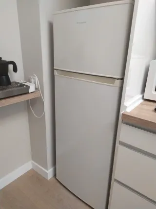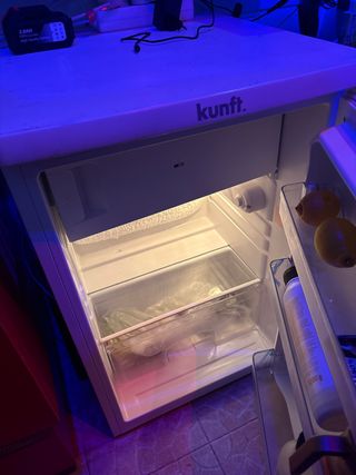 Nevera compacta de la marca Kunft. Ideal para espacios pequeños o como frigorífico .También tiene congelador pequeño - Diseño blanco. - Puerta con compartimentos Su Medida es 90cm de alto 55 cm de ancho Está práctica nuevo