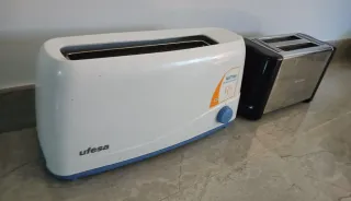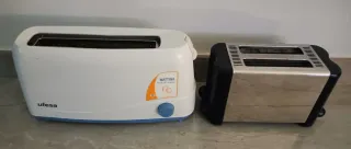 Se venden dos tostadoras juntas, una marca Ufesa y otra Mattina. - Tostadora Ufesa blanca con detalles en azul. - Tostadora Mattina electrónica de acero inoxidable y negro.