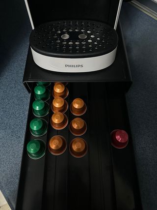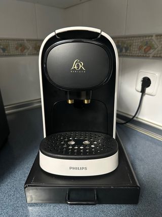 Cafetera Philips L'Or Barista en color negro. Diseñada para preparar café de forma rápida y sencilla. - Compatible con cápsulas L'Or. - Depósito de agua extraíble. - Bandeja recogegotas ajustable. Además, entregó base de distribución de cápsulas por marcas, colores, tipos de café etc