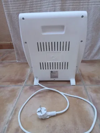 Calefactor eléctrico de la marca Klindo en color blanco. Cuenta con dos interruptores para regular la potencia. - Diseño compacto. - Rejilla protectora. - Cable de alimentación incluido.