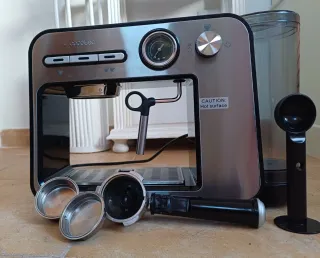 Cafetera de espresso SilverCrest en color negro con detalles cromados. - Diseño moderno y compacto. - Panel frontal con termómetro analógico. - Incluye portafiltro y rejilla. - Acabado brillante.