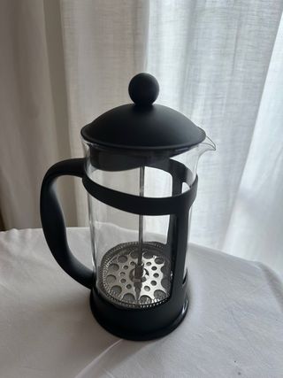 Cafetera de émbolo con un diseño elegante y funcional. - Jarra de vidrio resistente. - Marco y émbolo de metal. - Tapa negra con pomo.