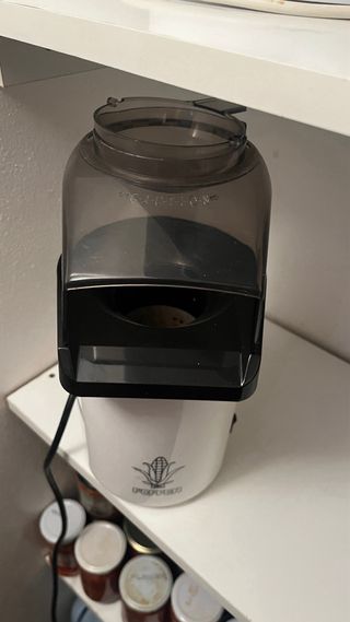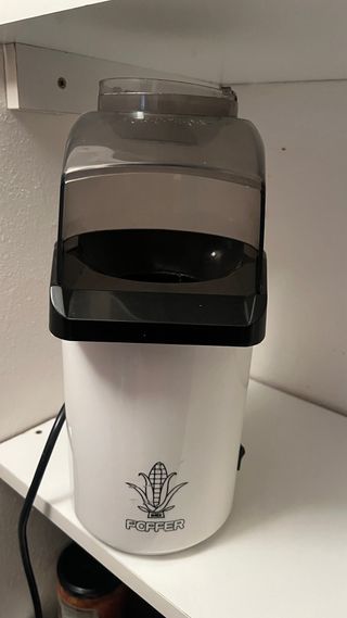 Máquina de palomitas de aire caliente con un diseño blanco y tapa transparente. - Marca: POFFER - Incluye dibujo de mazorca de maíz. - Tapa superior ahumada.