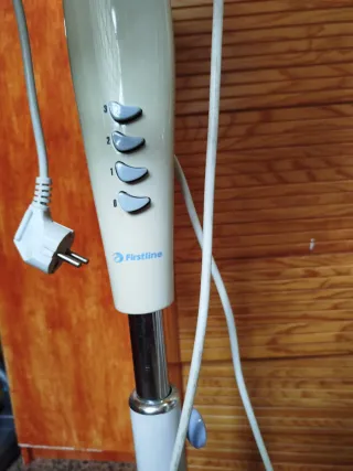 Ventilador de sobremesa Firstline. - Modelo FDF 30. - Rejilla protectora de metal. - Base de plástico. 3 velocidades. Función fija o en movimiento. Tiene un pequeño agujero en la base (ver foto). Tamaño grande: 55 cm alto y 38 cm de ancho. Cable de 2 metros. Recogida en mano ( no se envía)