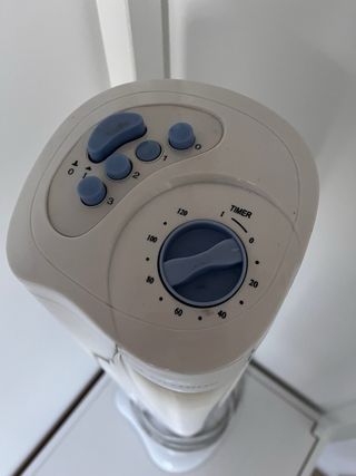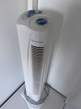 Ventilador de torre Firstline en color blanco. Diseño moderno y elegante. - Múltiples velocidades. - Temporizador. - Base estable.
