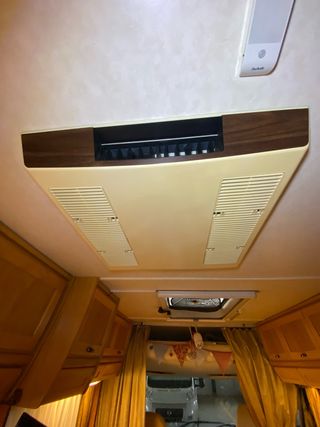 Sistema de aire acondicionado compacto diseñado para autocaravanas y caravanas. Montaje en 40X40 - Unidad de techo. - Diseño integrado y discreto. - Acabado en color crema con detalles en imitación madera. Aun esta montado y se puede probar Excelente funcionamiento Calidad Alemana
