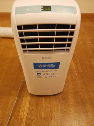Aire acondicionado portátil Olimpia Splendid Dolceclima Compact 10P. El más potente de la gama Compact: refresca hasta 2.6 kW de potencia y elimina la humedad con solo la función de deshumidificación. Práctico de desplazar y utilizar en diferentes ambientes gracias a sus formas compactas y al mando a distancia multifunción. Tamaño reducido: sólo 70 cm de altura y 35 cm de profundidad, ruedas giratorias. Sin depósito: eliminación automática de la condensación. Potencia refrigeración: 10.000 BTU Clasificación A+ Refrigerante R290 Tubo expulsion y adaptadores. Usado durante menos de una semana en un stand de la Feria de Muestras de