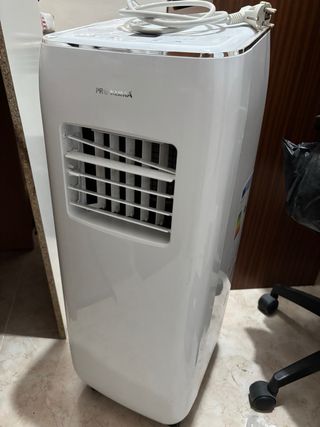 Se vende aire acondicionado portátil PRKLIMA, en buen estado. Es de color blanco y tiene ruedas para facilitar su transporte. Tiene la rejilla rota aunque eso no influye en su funcionamiento. - Modelo: PRKLIMA - Bajo consumo energético (clase A) - Fácil de transportar gracias a sus ruedas - Color blanco