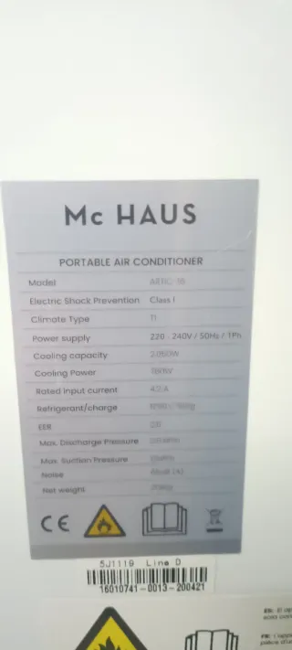 Aire acondicionado portátil de la marca Mc Haus. Ideal para mantener tu espacio fresco. - Diseño moderno y compacto. - Rejilla frontal ajustable.