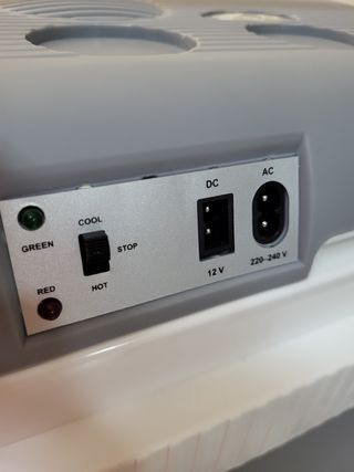 Nevera portátil que enfría y calienta. - Color gris y blanco. - Incluye etiqueta de precio de 65€.