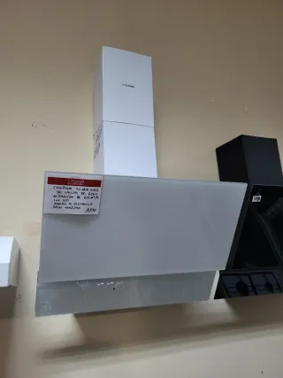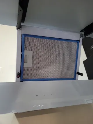 Campana extractora de cristal blanco de 90cm nueva a estrenar con una aspiración muy potente de 650m3 hora, táctil o controlable con mando a distancia, luz Led, bajo consumo sólo 140w al máximo, contiene dos embellecedores y piezas para colocarla