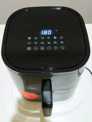 Está complemente nueva, sin usar. Con pantalla digital táctil, capacidad total de 5 litros, temperatura de 80 a 200ºC, 12 programas preestablecidos, temporizador hasta 60 minutos, 1400W de potencia, cestillo antiadherente. Libre de BPA y PFOA.