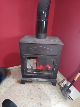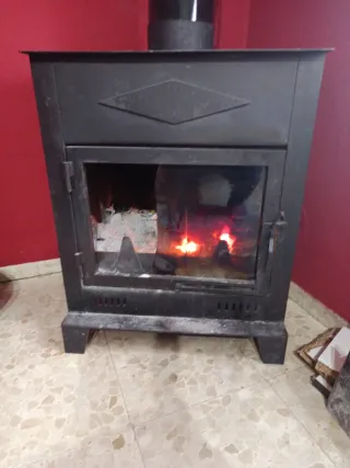 Estufa de leña grande y con un diseño atractivo. - Chimenea negra. - Puerta con cristal. - Base con patas. Super bonita i grande único fallo cristal roto pero no vale mucho es grande i queda preciosa i calienta mucho la vendo por cambio a una de pellets tiene doble coraza i agujeros para que salga más calor solo interesados