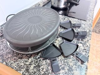 Raclette eléctrica de la marca Severin. Incluye la plancha superior y las pequeñas sartenes. - Plancha con diseño. - Varias sartenes. - Base metálica.
