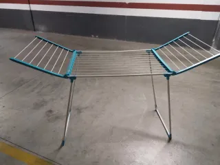 Tendedero plegable de color azul y blanco. - Estructura de rejilla blanca. - Bordes de plástico azul.