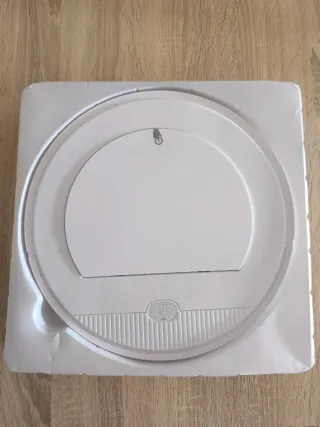 Robot aspirador Rumba, diseño redondo y moderno. - Color blanco. - Botón de encendido/apagado. - Indicador de carga.