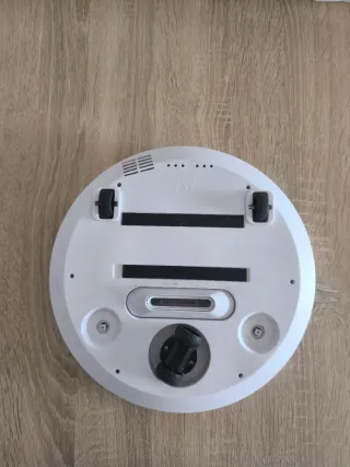 Robot aspirador de la marca Xiaomi, diseño redondo y color blanco. - Logo de la marca en la parte superior. - Botones de control y sensor en la parte frontal.