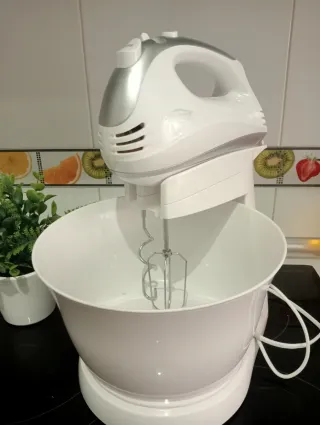 Batidora de mano blanca con bol. - Incluye varillas para batir. - Diseño moderno y funcional. 3'5 l 300W