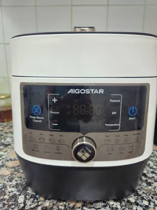 Olla multifuncional Aigostar en excelente estado, con muy poco uso. - Panel de control digital con pantalla. - Botones táctiles para funciones: Keep Warm, Cancel, Preset, Texture, DIY, Start. - Selector giratorio para menú y temperatura. - Indicadores luminosos para programas. - Diseño moderno en blanco y negro.