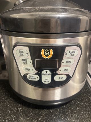 Robot de cocina GM, ideal para preparar una gran variedad de platos. Este modelo cuenta con múltiples funciones para facilitar la cocina. - Funciones: Guiso, Sopa, Arroz, Pasta, Vapor, Caliente/Recalentar, Plancha/Freír, Horno, Lento, Temp. - Pantalla digital. - Botones de ajuste de tiempo y cancelación.