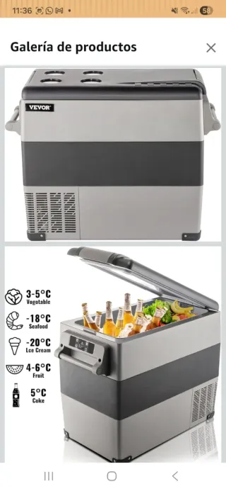 Nevera portátil VEVOR de 55 litros, ideal para coche o camping. - Capacidad de 55 litros. - Temperatura ajustable para refrigerar o congelar. - Pantalla digital para control de temperatura. - Diseño robusto y portátil.