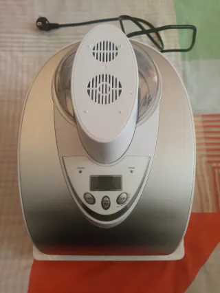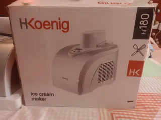 Máquina para hacer helados HKoenig, modelo HF180. Ideal para preparar tus propios postres caseros. - Diseño moderno y compacto. - Marca: HKoenig. - Modelo: HF180. - Capacidad: 1L. Viene con libro de instrucciones y pequeño libro de recetas para hacer tus helados. Trae sacabolas también. Solo se ha usado una vez, ya que no tengo sitio en la cocina. Nueva vale 179€.