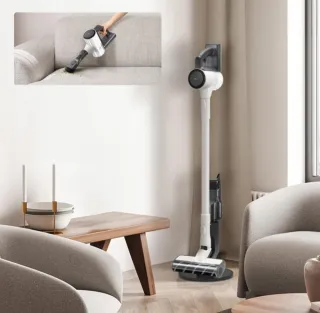 Aspiradora LG escoba de diseño moderno en color blanco y negro. Ideal para la limpieza del hogar. - Ligera y fácil de manejar. - Incluye accesorios para diferentes superficies.
