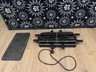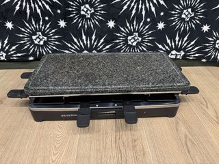 Raclette con superficie de piedra natural para cocinar. - Placa de piedra. - Con 8 bandejas individuales para cocinar debajo. - Marca Severin. Cocina, plancha, cocinar, fiesta, amigos, invitados, carne, pescado, verdura