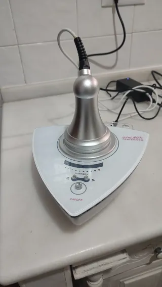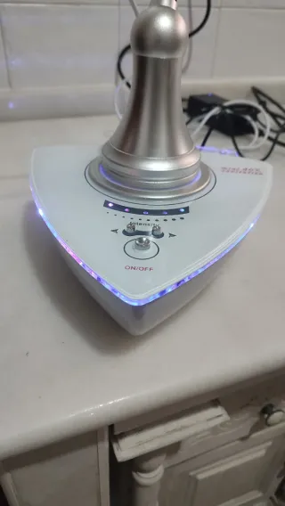 Máquina de minicavitación estética con diseño triangular y acabado blanco brillante. Incluye un cabezal plateado con forma de campana. - Indicador de intensidad con luces LED. Incluye de regalo gel conductor.