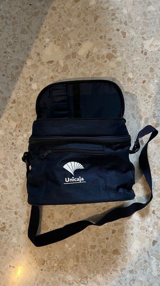 Nevera portátil de color azul marino con el logo de Unicaja. - Incluye dos vasos y dos servilletas - Compartimento. - Bolsillo frontal con cremallera. - Correa ajustable para colgar. - Interior forrado.