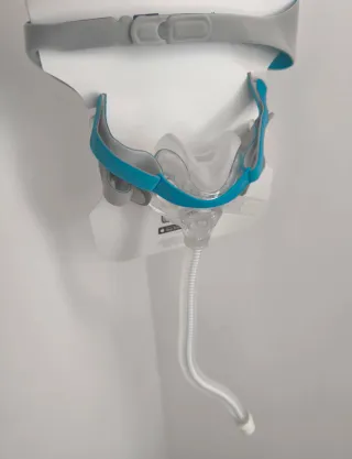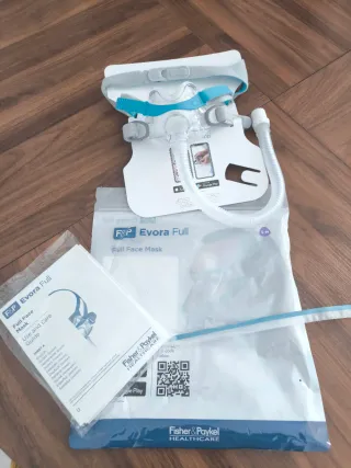 Mascarilla buconasal F&P Evora Full para CPAP. Incluye guía de uso y cuidado. - Talla S-M. ( Es la talla intermedia de tres tallas ) - Diseño ligero y cómodo. - Arnés ajustable. - Tubo flexible.