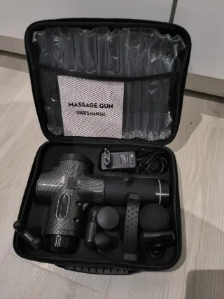 Pistola de masaje profesional con todos sus accesorios y manual de usuario. - Diseño ergonómico y acabado en carbono. - Incluye cargador y varios cabezales de masaje. - Estuche rígido para transporte y protección.