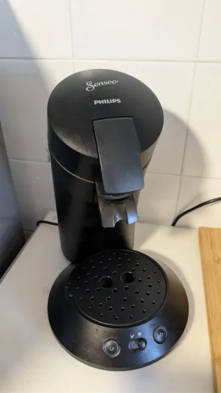 Cafetera Philips Senseo en color negro. Diseñada para preparar tu café de forma rápida y sencilla. - Diseño compacto y elegante. - Base para taza ajustable. - Botones de control intuitivos.
