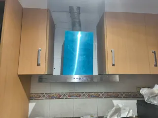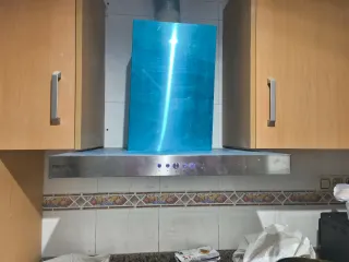 Campana extractora de cocina con acabado en acero inoxidable y detalles en madera. - Diseño moderno. - Panel de control con luces. - Incluye protector azul en la parte frontal. Solo dejada caer ni se conecto nunca