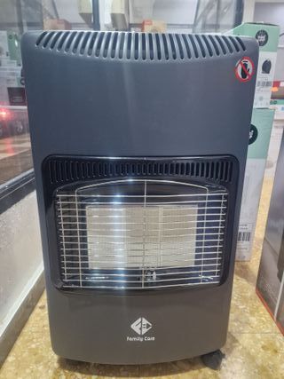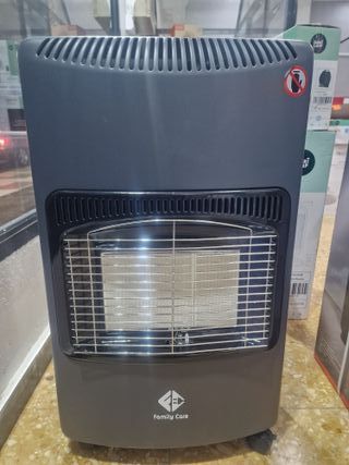 Estufa Family Care de gas, ideal para calentar espacios. - Diseño moderno en color gris. - Rejilla frontal protectora. - Ruedas para fácil movilidad.