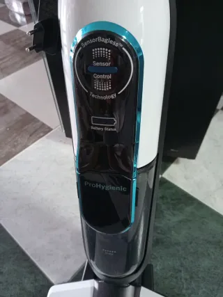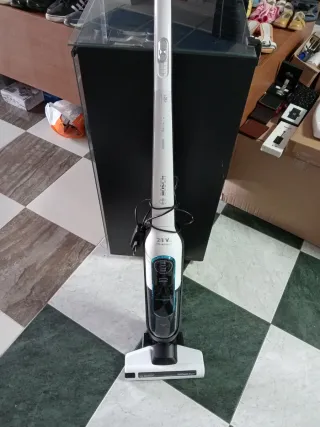 Aspiradora vertical inalámbrica de la marca Bosch. - Modelo: Unlimited Serie | 6. - Voltaje: 28 V. - Color: Blanco y negro con detalles en azul. - Diseño ligero y ergonómico.